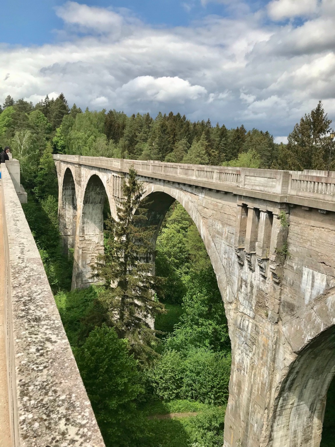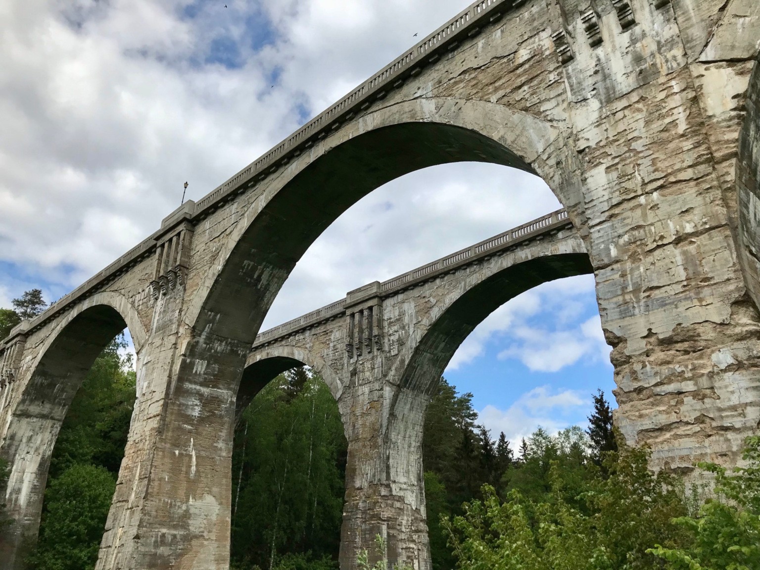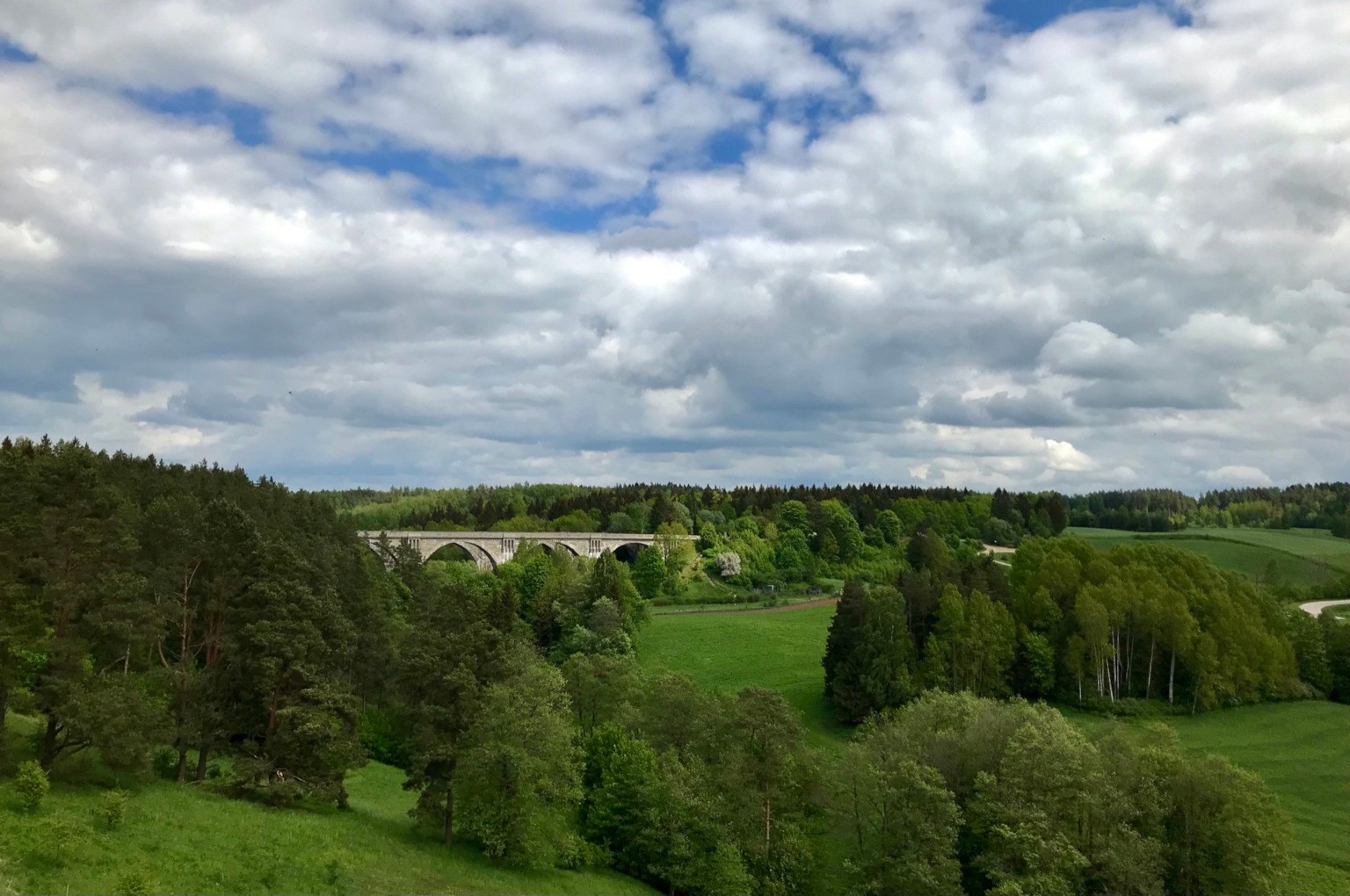Tytułowe mosty to fragmenty dawnej linii kolejowej nazywane akweduktami Puszczy Rominckiej. Niezwykle fotograficzne miejsce, doczekało się nawet wieży widokowej kilkaset metrów wcześniej. O ile wieża jest darmowa jak i parking pod nią (kilkanaście aut, w sezonie może być tłoczno), o tyle wstęp na mosty jest płatny i to tylko gotówką – 8PLN za osobę jeśli dobrze pamiętam. Parking pod mostami jest darmowy.