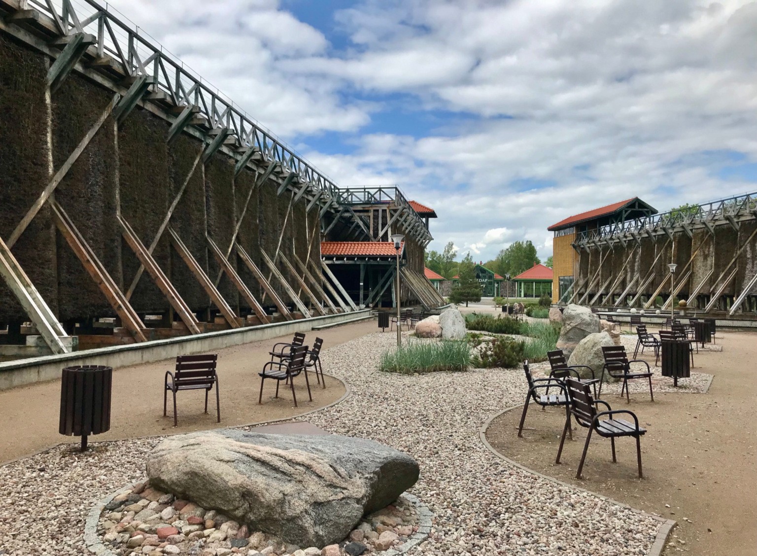 Nie przeszkodziło to w zbadaniu atrakcji. Sama tężnia to konstrukcja wysoka na 8 metrów i długa na ponad 200! Zasilana jest solanką z blisko 650 metrów pod powierzchnią ziemi i spływając tworzy aerozol, którego wdychanie korzystnie wpływa na działanie organizmu. Aż mimowolnie chce się odetchnąć pełną piersią. Dodatkowo można wykupić wejściówkę na górę całej konstrukcji, by mieć lepszy widok – z tego akurat nie skorzystaliśmy.