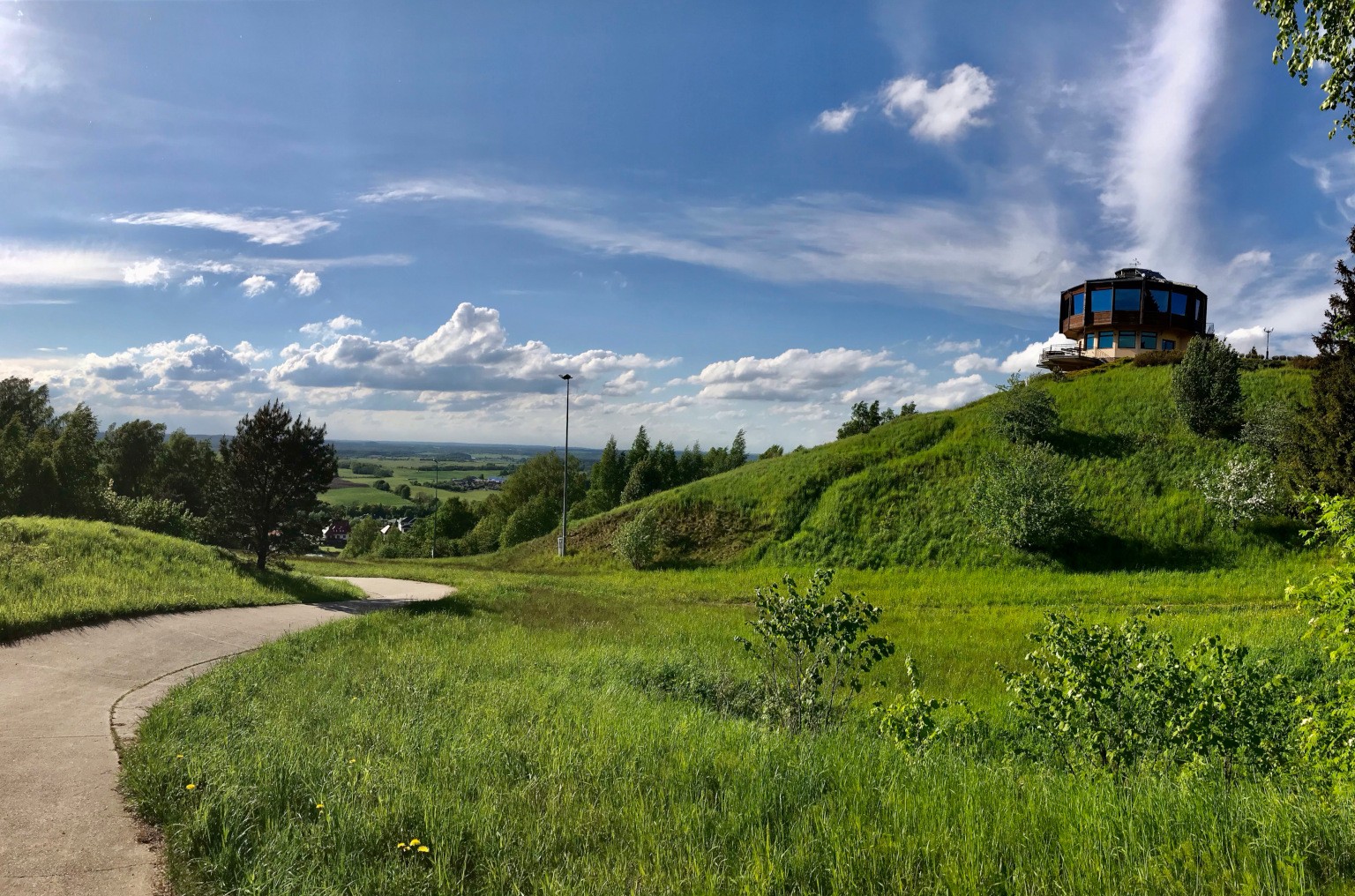 Praktycznie w tym miejscu skierowaliśmy się do hotelu, ale jeśli Wy nie jesteście jeszcze głodni to polecam podjechać na parking obok Zajazdu Piękna Góra. Stamtąd torem saneczkowym (będącym w istocie asfaltowym chodnikiem) będziecie mogli wdrapać się do kawiarni z widokiem na szczycie. Ważnym szczegółem jednak jest to, że konstrukcja jest obrotowa i wykonuje obrót w ciągu godziny, a Wy możecie nacieszyć się widokami… jeśli traficie na otwartą, bo my niestety zastaliśmy już zamknięty obiekt. Natomiast widoki mimo wszystko przednie!